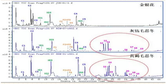 此時(shí)又有人問小編了,既然如此相近為什么現(xiàn)在又要將其區(qū)分呢?問得真好,容寶寶撓撓頭好好想想。兩者相同之處雖有很多,但除了產(chǎn)地的區(qū)別(金銀花多產(chǎn)于北方,山銀花多產(chǎn)于南方);最明顯的區(qū)別也在于藥材所含天然化合物成分的差異,山銀花中的灰氈毛忍冬皂苷乙Macranthoidin B(S2)、灰氈毛忍冬皂苷甲Macranthoidin A(S3)和川續(xù)斷皂苷乙Dipsacoside B(S4)就是金銀花中所沒有的。