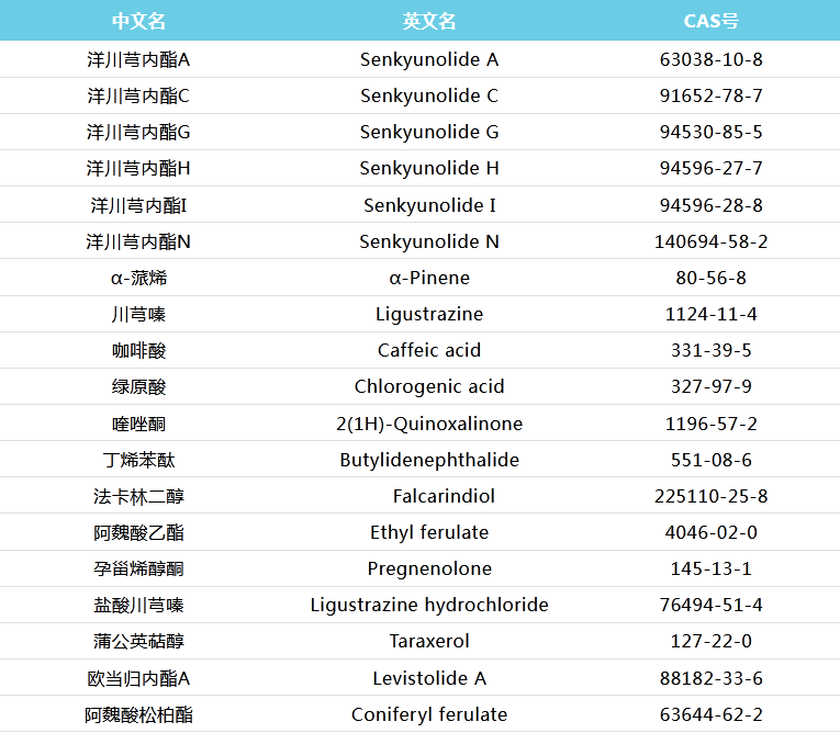 目前我司共有多種川芎活性成分,其中洋川芎內(nèi)酯C是普思生物新研的稀有化合物,洋川芎內(nèi)酯A和C相較于藥材中其他成分含量低但仍能發(fā)揮出優(yōu)良的抗炎活性,減輕各類疾病中的炎癥反應(yīng),還可作用相應(yīng)靶點(diǎn)表現(xiàn)鎮(zhèn)痛功效,故可作為川芎的指標(biāo)性成分。