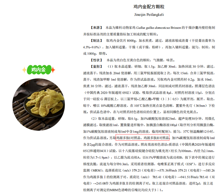 雞內(nèi)金為雉科動物家雞Gallus gallus domesticus Brisson的干燥沙囊內(nèi)壁,具有健胃消食,澀精止遺,通淋化石的功效,臨床上廣泛應(yīng)用于食積不化、小兒疳積、遺尿、遺精,又可用于膽結(jié)石、尿路結(jié)石等病癥的治療。普思生物新品雞源多肽I、雞源多肽II對照品,有效對雞內(nèi)金、炒雞內(nèi)金配方顆粒進行質(zhì)量控制。