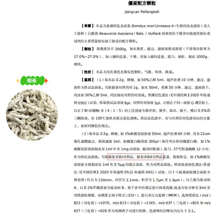 僵蠶為蠶蛾科昆蟲家蠶Bombyx mori Linnaeus 4?5齡的幼蟲感染(或人工接種)白僵菌Beauveria bassiana (Bals.) Vuillant而致死的干燥體,具有息風(fēng)止痙、祛風(fēng)止痛、化痰散結(jié)的功效。普思生物新品僵蠶多肽I、僵蠶多肽II和僵蠶八肽對照品,有效對僵蠶、炒僵蠶配方顆粒進行質(zhì)量控制。