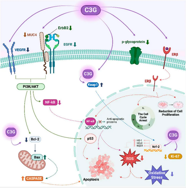C3G對(duì)女性生殖健康有益,能保護(hù)卵巢細(xì)胞免受氧化應(yīng)激,抑制卵巢癌和宮頸癌細(xì)胞生長(zhǎng),并可能緩解多囊卵巢綜合征(PCOS)。