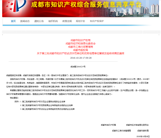 成都普思生物科技股份有限公司自2014年成為成都市知識(shí)產(chǎn)權(quán)試點(diǎn)企業(yè)以來,公司不斷進(jìn)取、日益壯大,努力實(shí)現(xiàn)產(chǎn)、學(xué)、研結(jié)合,提高了自主知識(shí)產(chǎn)權(quán)的數(shù)量和質(zhì)量,加快了知識(shí)產(chǎn)權(quán)的運(yùn)用轉(zhuǎn)化,在知識(shí)產(chǎn)權(quán)工作制度的完善、知識(shí)產(chǎn)權(quán)工作人才隊(duì)伍的壯大、專利的申請、轉(zhuǎn)化實(shí)施和相關(guān)產(chǎn)品銷售等方面都取得了豐碩的成果。在2016年10月成都市知識(shí)產(chǎn)權(quán)局組織的復(fù)核及驗(yàn)收工作中,成功通過驗(yàn)收,驗(yàn)收考核結(jié)果為“優(yōu)秀”。