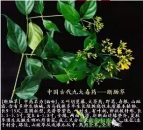 在我國(guó),稱為“斷腸草”的植物有9科、13屬、16種之多。常見的有大茶藥、野八角、紅毒茴、北烏頭、伏毛鐵棒錘、芹葉鐵線蓮、白屈菜、橢果、綠絨蒿、大葉紫堇、雞血七、地錦苗、石棉紫堇、金頂紫堇、黃根紫堇、金鉤如意草、師宗紫堇、長(zhǎng)距紫堇、無囊長(zhǎng)距紫堇、南黃堇、大海黃堇、刻葉紫堇、紫堇、尿罐草、蛇果黃堇、小花黃堇、黃堇、臭黃堇、小花棘豆、狼毒、雷公藤、鉤吻、斑莖蔓龍膽、羊角拗、古鉤藤、牛角瓜、天仙子、密蒙花、密花素馨、秋海棠。