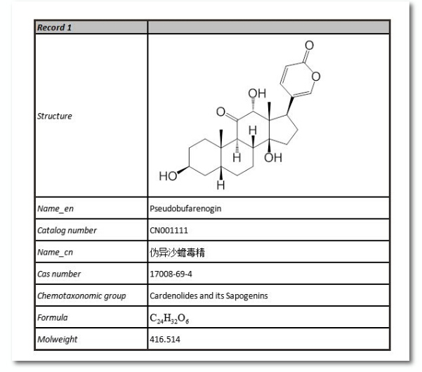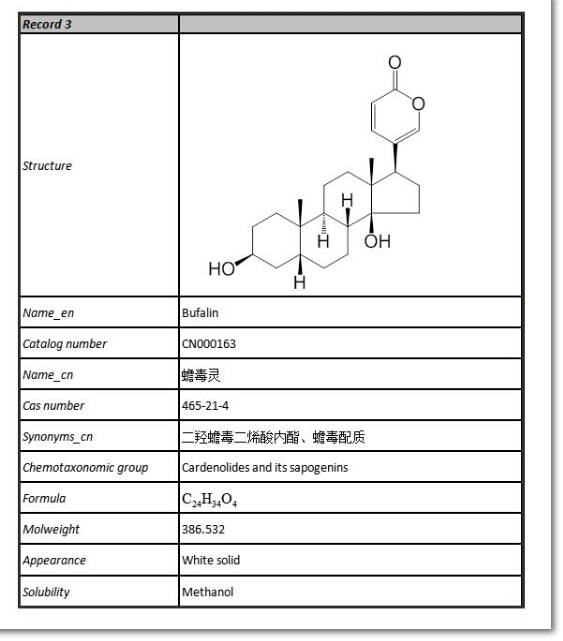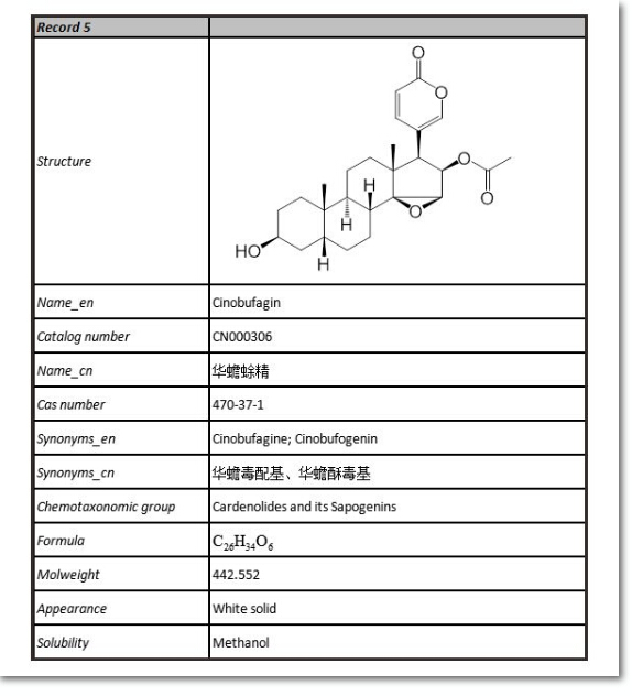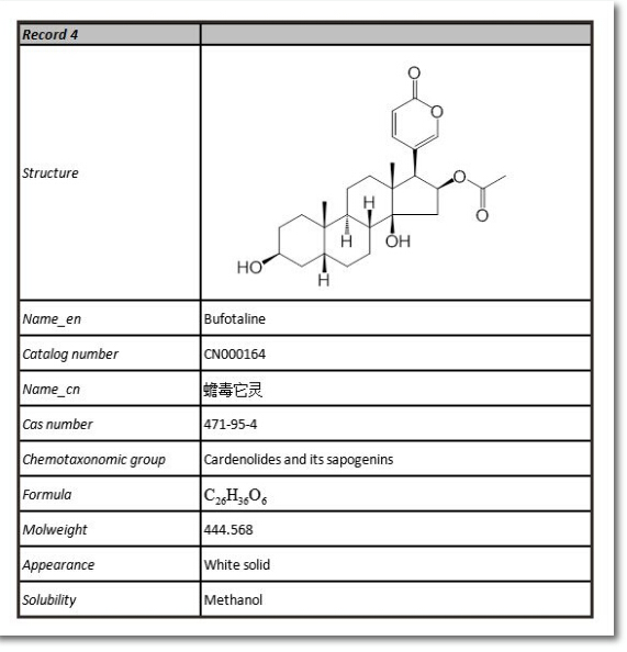 普思生物是一家專(zhuān)業(yè)從事天然藥物分離純化并提供藥物技術(shù)研究服務(wù)的國(guó)家高新技術(shù)企業(yè)。目前我司共有20多種蟾酥系列活性成分——酯蟾毒配基、蟾毒靈、蟾毒它靈、遠(yuǎn)華蟾蜍精、沙蟾毒精、日蟾蜍他靈、華蟾毒它靈、偽異沙蟾毒精、華蟾蜍精、去乙酰華蟾毒精、去乙酰華蟾毒它靈、南美蟾毒精、蟾蜍色胺、蟾蜍它里定、嚏根草醇、19-羥基蟾毒靈、華蟾毒精醇、酯蟾毒精、異沙蟾毒精、19-氧代華蟾毒它靈、19-氧代華蟾毒精等,部分產(chǎn)品信息如下: