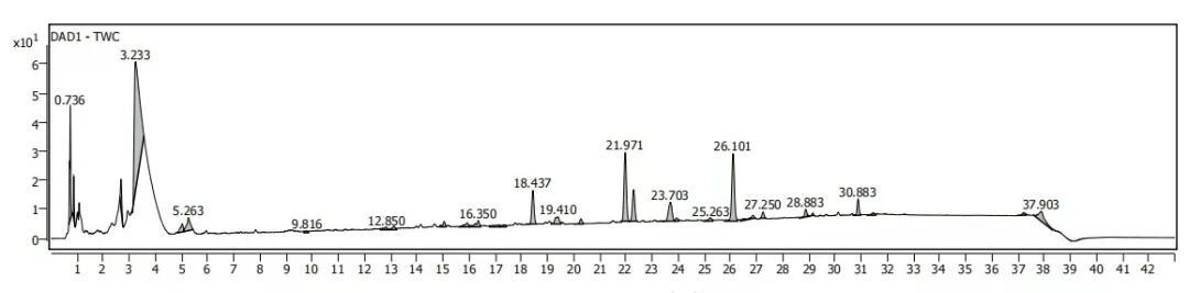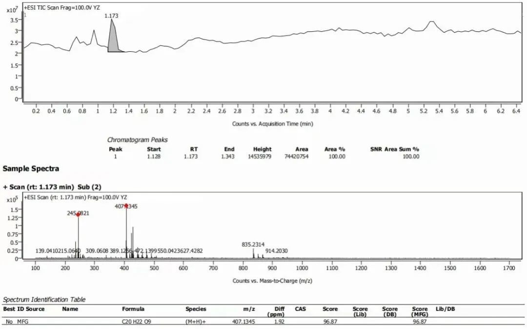 中藥材、浸膏/粉、復(fù)方制劑、發(fā)酵液等復(fù)雜樣品的化學(xué)成分分析。依托UPLC的高效分離能力和Q-TOF的快速鑒定能力,對(duì)各個(gè)特征峰進(jìn)行分析。通過多維信息分析給予推測(cè)分子式,再通過譜庫(kù)鑒定給予推測(cè)結(jié)構(gòu)式。
