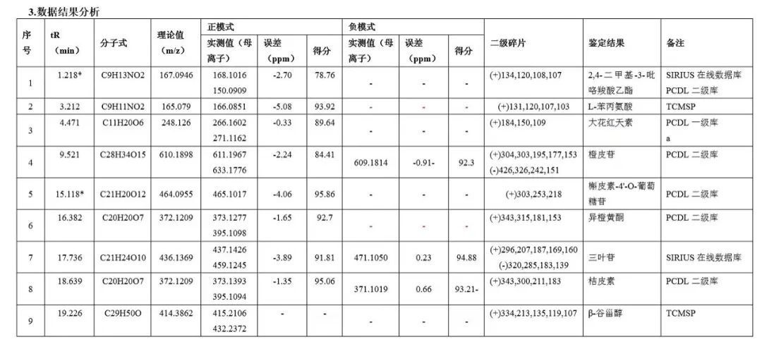 通過精確質(zhì)量、同位素豐度比、同位素精確質(zhì)量比及MS/MS四維信息關(guān)聯(lián)分析給予推測(cè)分子量、分子式,部分化合物可通過譜庫(kù)鑒定給予結(jié)構(gòu)式。