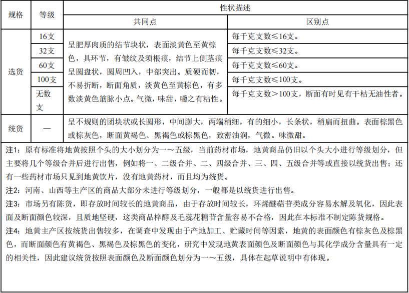 根據(jù)市場(chǎng)流通情況,對(duì)藥材是否進(jìn)行等級(jí)劃分,將地黃分為“選貨”和“統(tǒng)貨”兩個(gè)規(guī)格。