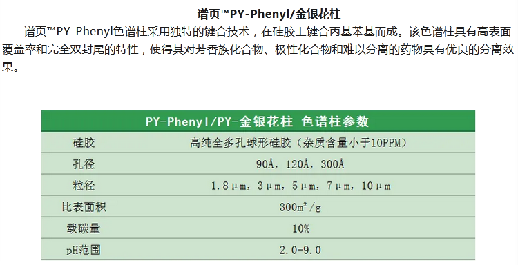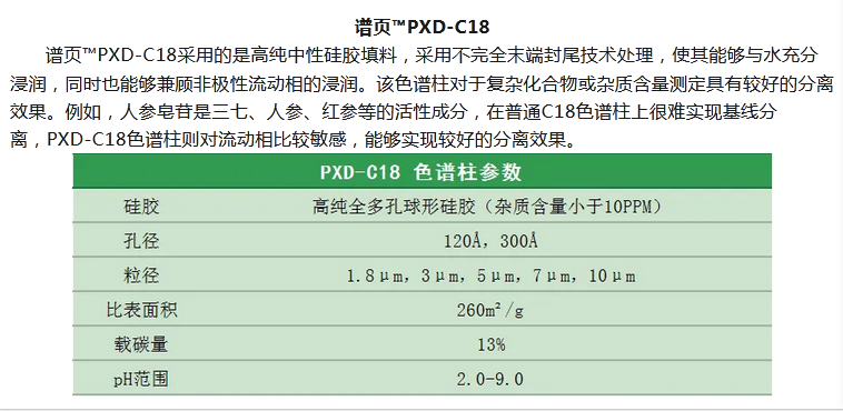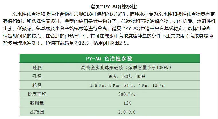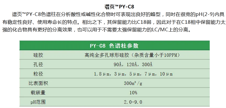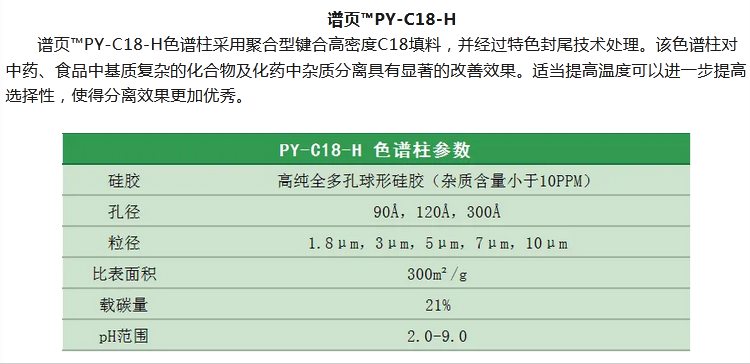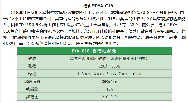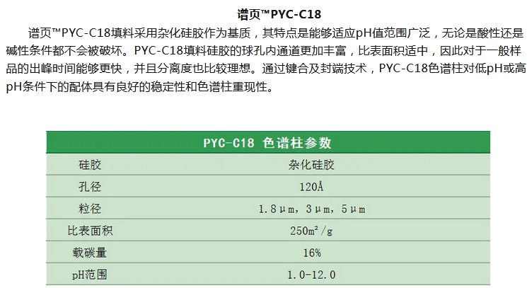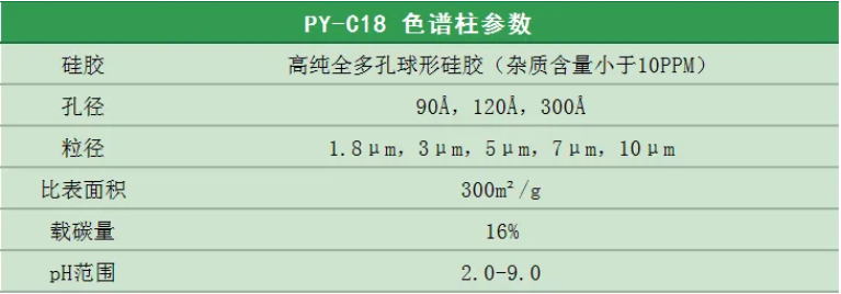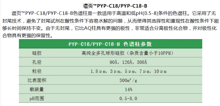 譜頁?PY-C18是本系列C18柱中最具普適性的色譜柱,具有優(yōu)異的穩(wěn)定性、獨特的官能團鍵合及均勻的小分子封尾技術(shù)涂層,確保固定相具有高選擇性。加上獨有的裝柱工藝,使其擁有穩(wěn)定的基床,從而具有更高的柱效及批次間穩(wěn)定性。適合分離酸性、中性和堿性化合物以及小分子多肽等。