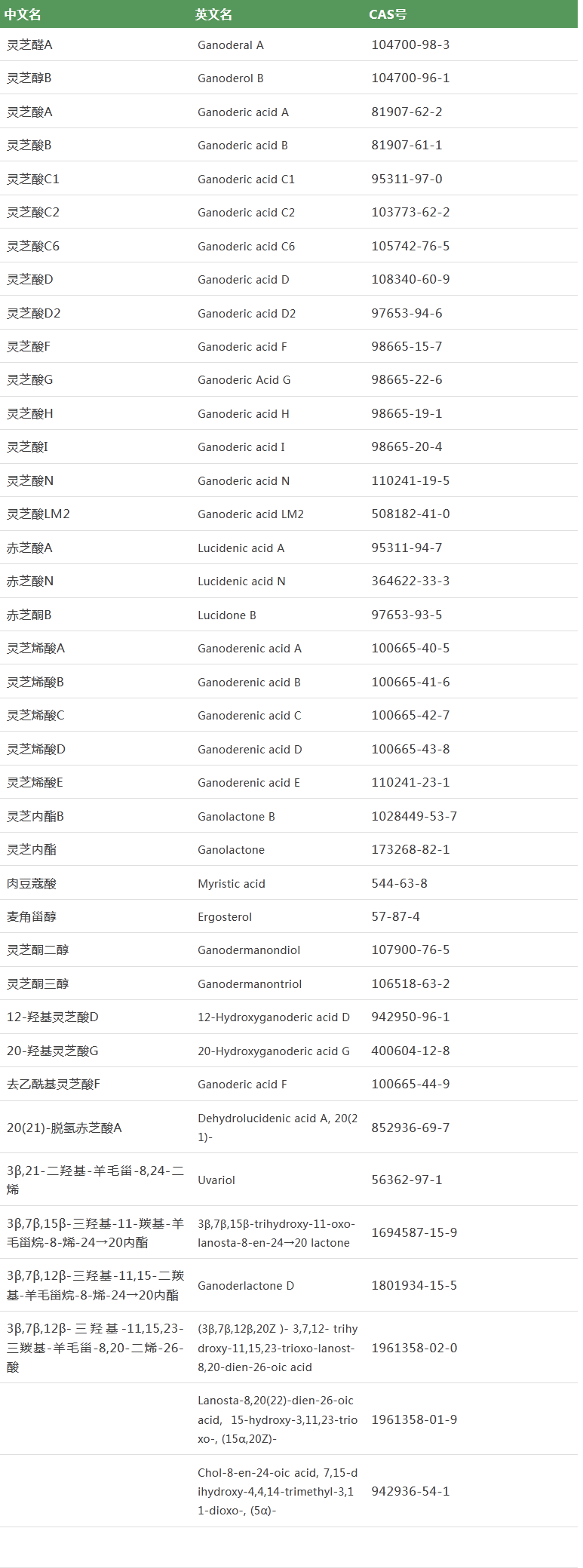 目前我司化合物庫有多種靈芝活性成分,針對以下重點推薦的產(chǎn)品,普思生物均現(xiàn)貨供應(yīng),當天發(fā)貨。
