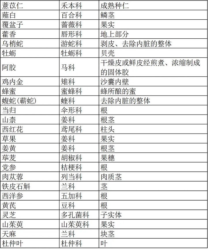人參、人參葉、人參果、三七、土茯苓、大薊、女貞子、山茱萸、川牛膝、川貝母、川芎、馬鹿胎、馬鹿茸、馬鹿骨、丹參、五加皮、五味子、升麻、天門冬、天麻、太子參、巴戟天、木香、木賊、牛蒡子、牛蒡根、車前子、車前草、北沙參、平貝母、玄參、生地黃、生何首烏、白及、白術(shù)、白芍、白豆蔻、石決明、石斛、地骨皮、當(dāng)歸、竹茹、紅花、紅景天、西洋參、吳茱萸、懷牛膝、杜仲、杜仲葉、沙苑子、牡丹皮、蘆薈、蒼術(shù)、補(bǔ)骨脂、訶子、赤芍、遠(yuǎn)志、麥冬、龜甲、佩蘭、側(cè)柏葉、制大黃、制何首烏、刺五加、刺玫果、澤蘭、澤瀉、玫瑰花、玫瑰茄、知母、羅布麻、苦丁茶、金蕎麥、金纓子、青皮、厚樸花、姜黃、枳殼、枳實(shí)、柏子仁、珍珠、絞股藍(lán)、胡蘆巴、茜草、蓽茇、韭菜子、首烏藤、香附、骨碎補(bǔ)、黨參、桑白皮、桑枝、浙貝母、益母草、積雪草、淫羊藿、菟絲子、野菊花、銀杏葉、黃芪、湖北貝母、番瀉葉、蛤蚧、越橘、槐實(shí)、蒲黃、蒺藜、蜂膠、酸角、墨旱蓮、熟大黃、熟地黃、鱉甲
