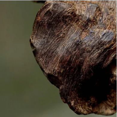 呈不規(guī)則塊、片狀或盔帽狀,有的為小碎塊。表面凹凸不平,有刀痕,偶有孔洞,可見黑褐色樹脂與黃白色木部相間的斑紋,孔洞及凹窩表面多呈朽木狀。質較堅實,斷面刺狀。氣芳香,味苦。