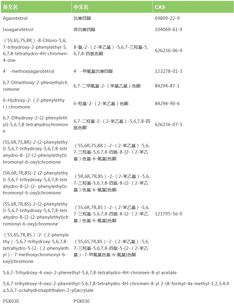 目前我司共有多種沉香色酮類活性成分,針對以下重點推薦的產品,普思生物均現貨供應,當天發(fā)貨(價格面議)。