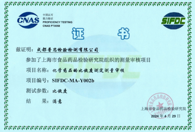 近日,成都普思生物科技股份有限公司旗下子公司“成都普思檢驗檢測有限公司”通過了由上海市食品藥品檢驗研究院于2024年組織的測量審核項目“化學藥品的比旋度測定”,結(jié)果為“滿意”。