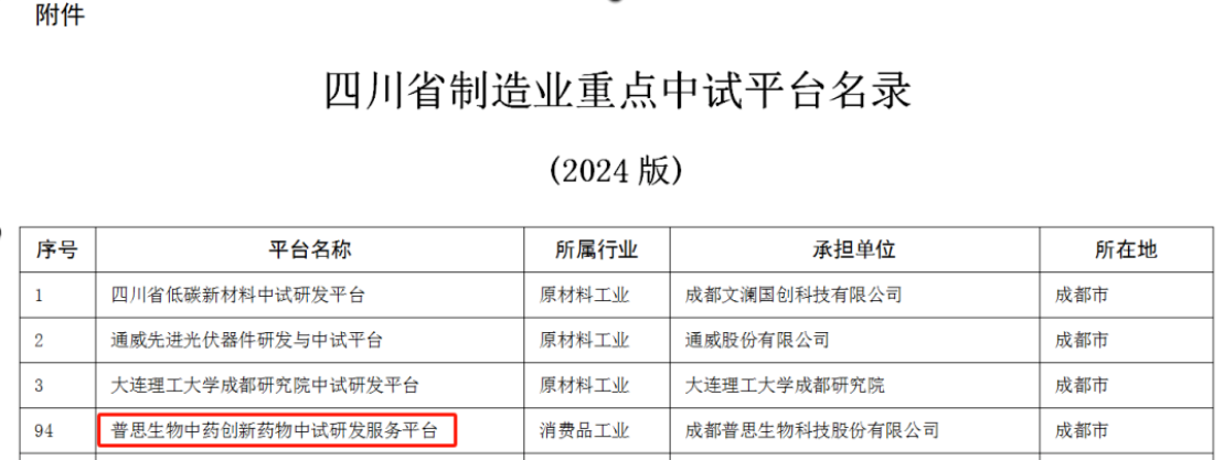 近日,四川省經(jīng)濟和信息化廳辦公室印發(fā)《四川省制造業(yè)重點中試平臺名錄(2024版)》,成都普思生物科技股份有限公司的“普思生物中藥創(chuàng)新藥物中試研發(fā)服務(wù)平臺”成功入選。??